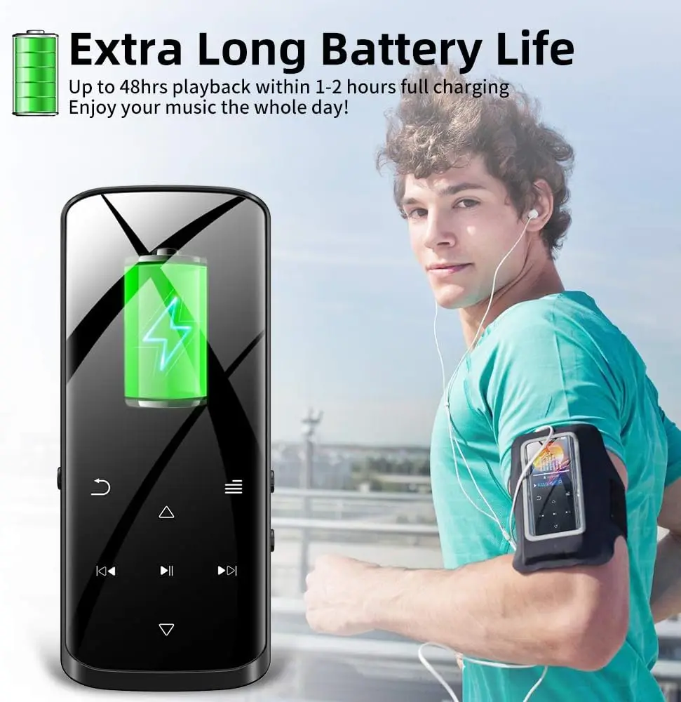 【Multi-functional Music Player】The mp3 player designed with music playing, Bluetooth 5.0 connection, built-in speaker, FM radio, voice recording, E-book reading(TXT file), video playing(128*160 AMV AVI converted video), photo Browsing, Screensaver, Alarm, Pedometer(No supported in Bluetooth mode), 25 Languages, Fast Rewind/Forward, Shuffle, etc. Solid metal body and portable size, perfect for Sport, fitness, running, traveling, etc.